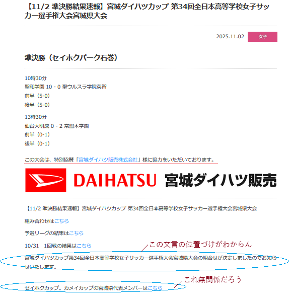 蛇足ですが、あれがなければ同点だったかも、のような考えはしないほうがいいです。2点差になって、明成がほっとして緩んだり、ウルスラは後ろを気にせず前に出るしかないんだってなったりしたのもあるだろうから、何がどう絡んだのかわかりません。さらに蛇足ですが、#2を上げた瞬間から#2に長いボールを出すことを徹底すべきところだったと思いますができてなかったと思います。ベンチとピッチ内の一人ひとりが意識をあわせないと。とにかく一つ一つ課題を解消していくしかないんですよ。